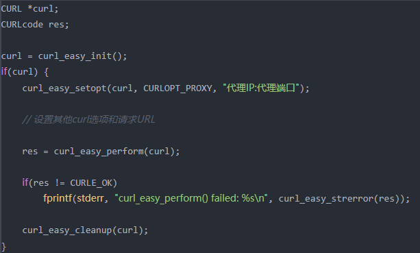 然后,在C語言中使用HTTP代理需要設置libcurl的選項。你可以使用curl_easy_setopt()函數來設置代理。以下是一個示例代碼如圖三所示,在該代碼中,我們使用curl_easy_init()函數初始化一個libcurl會話,并使用curl_easy_setopt()函數設置代理IP和端口。