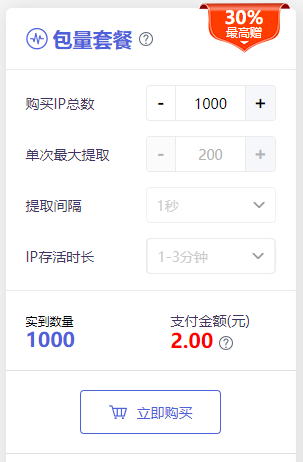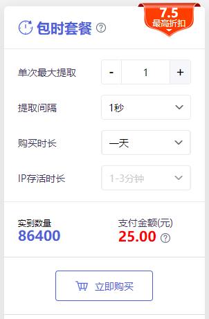 舉個例子,1秒提取間隔,一次提取1個IP,通過這兩個參數我們可以得出每分鐘可以提取到60個IP,每天可以提取到86400個IP,劃下來1萬個代理IP不到3元錢的單價,價格非常的便宜。