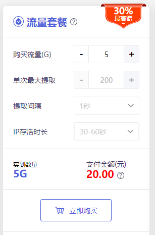 舉個例子:張三的業務是爬取實時變動的商品價格數據,每條商品價格數據對一個IP造成的流量大約為5KB左右。1G=1024M=1048576KB,由此得出1G流量可使用約20萬代理IP。價格非常的便宜,需要注意的是流量套餐不適合大流量業務。