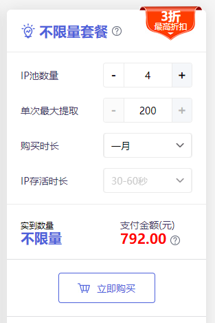 所以包時套餐適合穩定提取間隔頻率,固定每次提取IP數量,每天或者長期穩定需要代理IP的業務使用。價格非常便宜,但是靈活性沒有包量套餐那么強。正是因為提取靈活性和時間自由性的缺陷,所以包時套餐價格比包量套餐便宜很多,但是他倆質量是一模一樣的,因為是同一個IP池。
